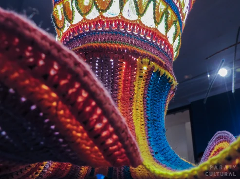 Entre os painéis, há um calendário ilustrado das festas de Paraty, outro de barcos espelhados no mar, e as quilombolas dançando o jongo, com saias floridas. Há ainda um peixe-elétrico, tecido sobre base de arame, que virou luminária. Tudo em cores puras, sem linhas mescladas ou barbantes crus. Sua marca, acredita ela, são as cores fortes. “A cor moderniza o crochê”, diz a artesã. O azul-turquesa do mar, o vermelho dos hibiscos, o verde-bandeira das bananeiras, o amarelo-ouro do sol, dão o tom, recriando a cidade histórica em cenários multicoloridos e surpreendentes.