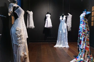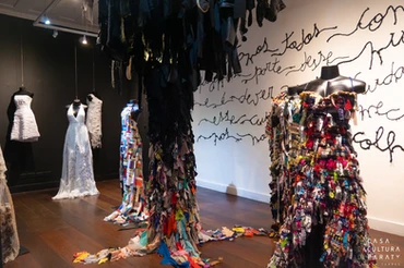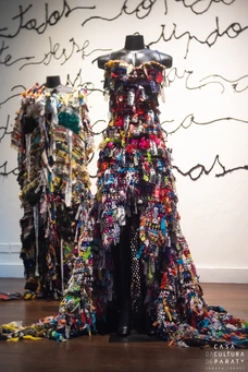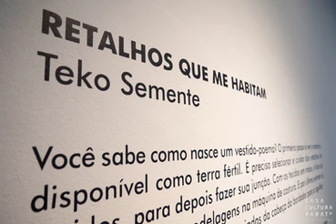 Entusiasta da simplicidade, o artista transfere para o seu trabalho a leveza da vida por entre a mata, os banhos de cachoeira, as risadas dos filhos e as frutas colhidas no pé. Dono de uma sensibilidade ímpar, Teko deixou de escrever apenas no papel em branco e começou a bordar poesias à mão, em cada peça que produz. Foi assim que nasceram os vestidos-poema presentes nessa sala. Com retalhos, linhas, cores e palavras, Teko se aventura pelo ofício de vestir o mundo de poesia.
