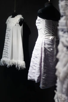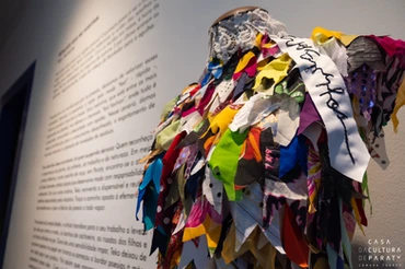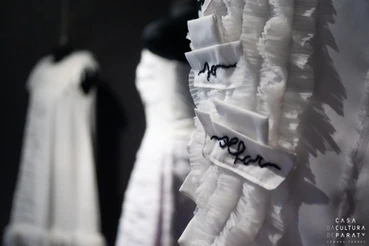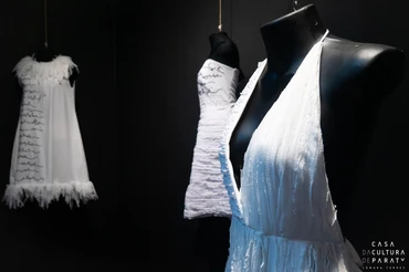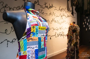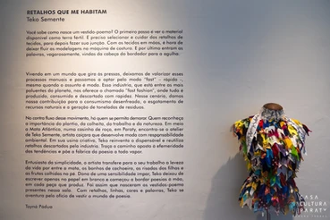Um vestido-poema nasce da escolha e união cuidadosa dos retalhos, modelados na costura. Por fim, as palavras surgem devagar, passando da cabeça do bordador para a agulha.